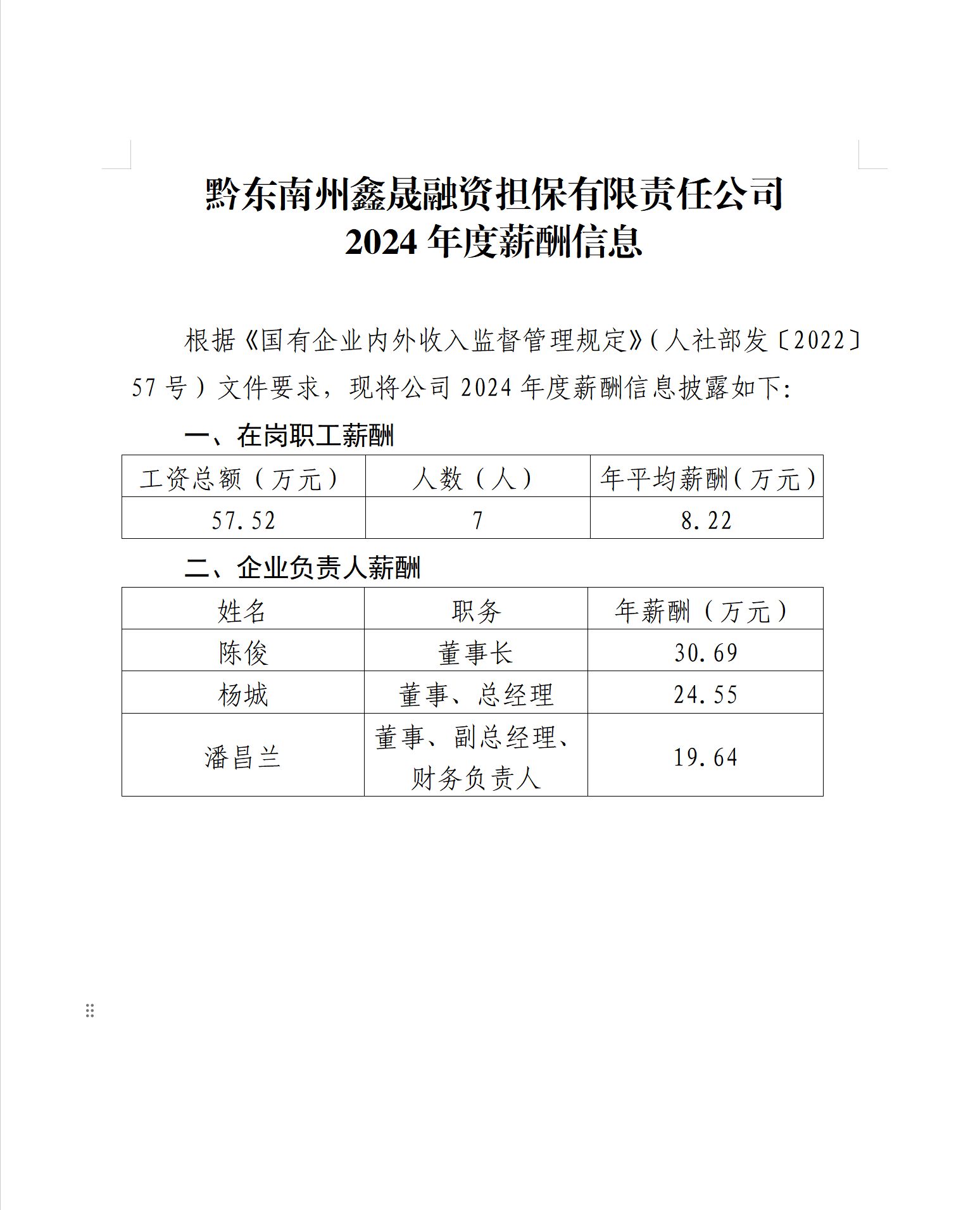 黔东南州鑫晟融资担保有限责任公司2024年度薪酬信息